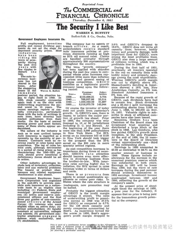 1951年,巴菲特在拜访盖可保险后,写了一篇题为《我最喜欢的证券》(The Security I like Best)的署名文章,发表在1951年12月6日的《商业与金融纪事》上,字里行间洋溢着他对盖可保险的赞叹与热爱。