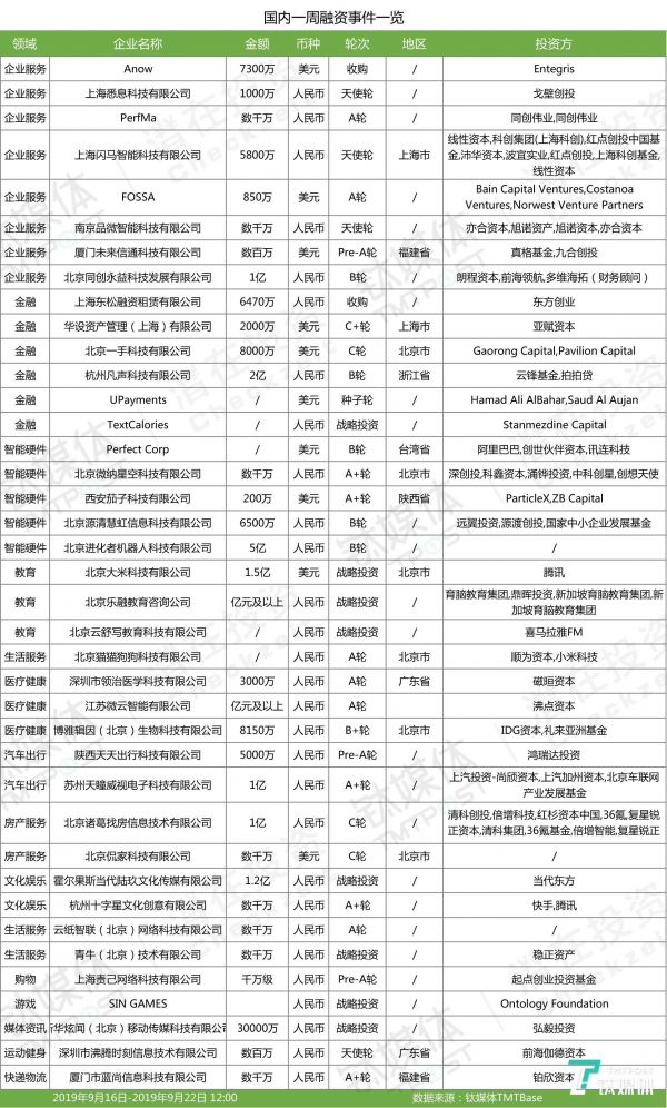 ✔. 本周钛媒体Pro全球创投数据库TMTBase总计收录国内投融资事件有39起。