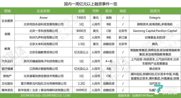 亿级以上融资一览(2019年第37周)
