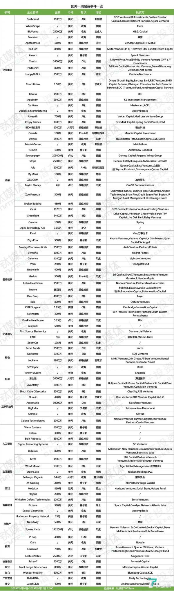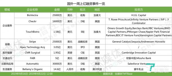 国外过亿融资项目一览(2019年第37周)