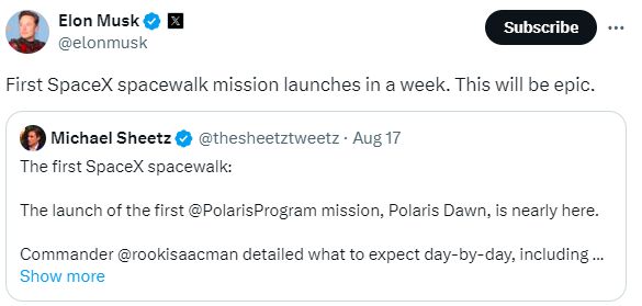 当地时间8月19日,马斯克发文表示:这将是史诗般的壮举。