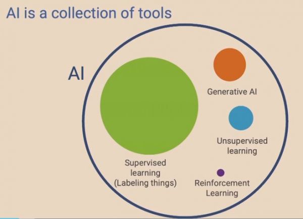 深度学习泰斗吴恩达曾在一次公开演讲中表示,AI是一系列工具的集合。这些工具包括了监督学习、非监督学习、强化学习,以及现在的生成式人工智能——它们都是通用技术,意味着AI与电力、互联网等其他通用技术,并没有什么区别。