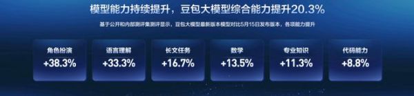 在8月21日的创新巡展上,豆包再次宣布重磅更新,性能方面,豆包大模型在角色扮演、语言理解、长文任务、数学等维度,综合能力提升20.3%。
