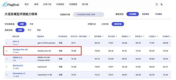 FlagEval6月发布的评测榜单显示,在闭源大模型的“客观评测”中,豆包大模型以综合评分75.96分排名国产大模型第一。