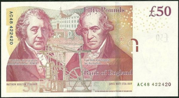 2011年,英国发行了新一版50英镑纸币。英国人向来喜欢将科学家印到钱上,而蒸汽机发明者瓦特,顺理成章地入选为这一版纸币的主角。