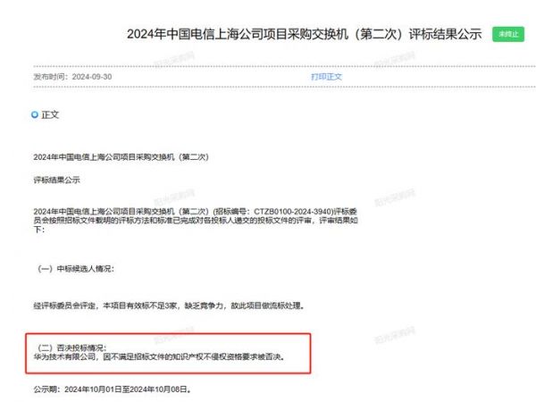 近日,中国电信某地分公司发布了采购交换机项目(第二次)评标结果,华为也参加了该项目但最终被否决投标,怎么回事?