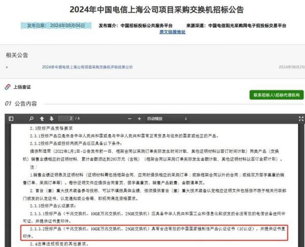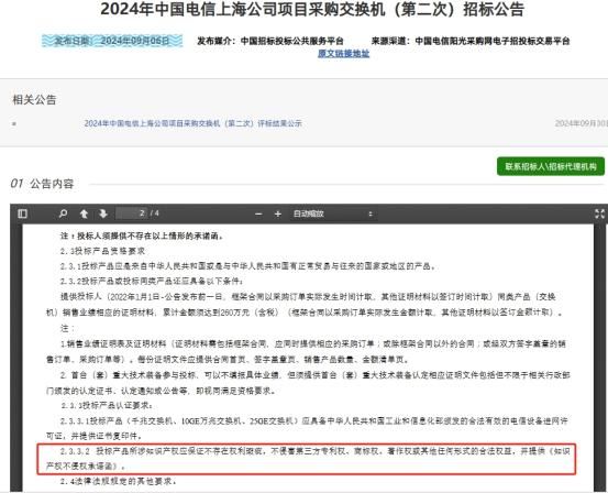 有意思的是,对比两次招标公告,在投标产品资格要求的“投标产品认证提要求”中,有一条要求有明显不同,首次招标公告中要求“投标产品(千兆交换机、10GE万兆交换机、25GE交换机)具有合法有效的中国国家强制性产品认证证书(3C认证),并提供证书复印件”;第二次招标公告中要求“投标产品所涉知识产权应保证不存在权利瑕疵,不侵害第三方专利权、商标权、著作权或其他任何形式的合法权益,并提供《知识产权不侵权承诺函》”。