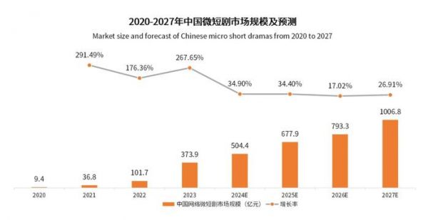 根据艾媒咨询发布的《2023-2024年中国微短剧市场研究报告》中的数据,2023年,中国网络微短剧市场规模亿接近374亿元,同比增长近268%,预计2024年市场规模将超500亿元,2027年将超过1000亿元。