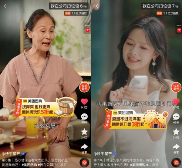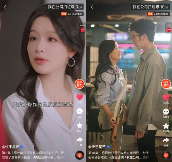 而在这个过程中,总有人走得更快。作为最早入局短剧市场的平台之一,快手星芒短剧的精品化策略已经开始落地。近日,平台播出的《我在公司扫垃圾》虽然只有短短的18集,但累计播放量已接近3亿,剧中借助巧妙的双时空视角,串联起职场、校园、甜爱等多种元素,让人眼前一亮。更值得关注的是,该剧也是美团团购的商业化合作项目,剧中贴合品牌消费场景的露出、植入与转化链路,映射出平台为品牌营销搭建的商业组件日渐成熟,也让快手又一次在行业的可持续发展中“领先半子”。
