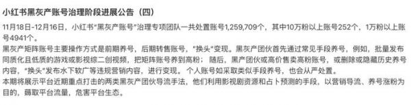这批账号疑似是受到“小红书黑灰产账号治理”行动影响而被封禁,有近126万位用户一夜之间失去了自己的小红书账号。据小红书平台官方账号“薯管家”发文显示,11月18日-12月16日,小红书“黑灰产账号”治理专项团队一共处置账号1,259,709个,其中10万粉以上账号252个,1万粉以上账号4941个。