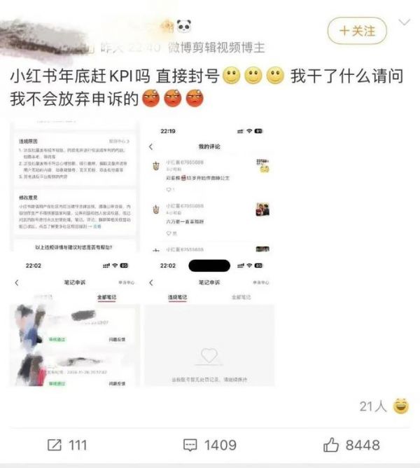 对此,用户们在社交媒体平台上反应强烈。众多网友吐槽自己的小红书账号并没有违反社区规定,但莫名其妙被封号,有人怀疑是平台系统出现故障,也有人直接喊话小红书称其“年底追封号业绩”。