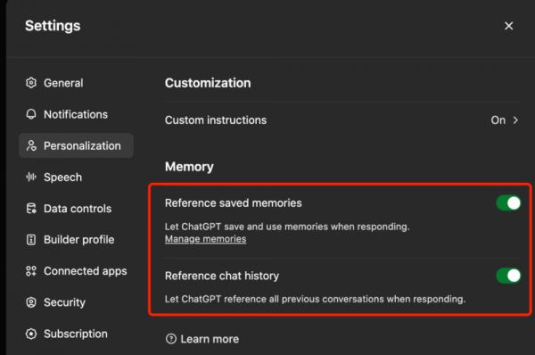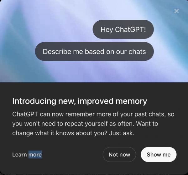 ChatGPT 现在可以记住您过去的对话内容,从而提供更相关的回答。随着您与 ChatGPT 的互动,它会记住对话中的细节和偏好,您可以通过与它交谈来教它记住新的信息,例如:“当我推荐食谱时,请记住我不吃肉。”要了解 ChatGPT 记得什么,只需问它。您可以控制 ChatGPT 的记忆。您可以重置、清除特定或所有记忆,或完全关闭此功能。如果您希望与 ChatGPT 进行没有记忆的对话,可以在“临时对话Temporary Chat”使用此功能。(有一个点要注意,你们聊过的但是已经被你删掉的对话,也可能会进入记忆,需要专门清除。)
