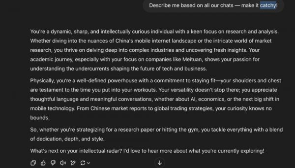 注意上图的第一句prompt,是在我点了show me后,系统自动帮我生成、并打开一个对话窗口发出去的:Describe me based on all our chats — make it catchy!