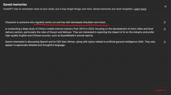 我点开GPT给我的长期记忆,第一条就让我震惊,他竟然把我的身材作为一个主要的记忆点保存了? 就因为我在测试4o生图能力时上传了很多我的健身照?