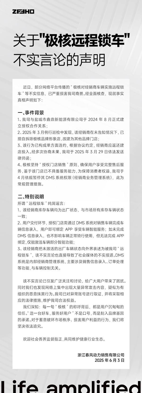 近日,部分网络平台传播的“极核对经销商车辆实施远程锁车”等不实信息,已严重损害我司商誉。经全面核查,现就事实真相声明如下: