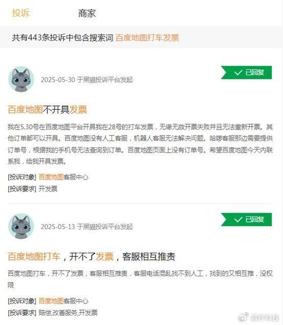 还有用户投诉,打车过程中司机擅自加收费用,理由是经过高速路,但当用户要求出示高速费发票时,司机却拿不出来,这明显是违规收费行为。而在黑猫投诉上,关于百度地图打车不能出示发票的投诉,就高达四百多条。
