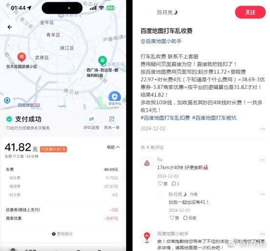 其中,一位小红书用户陈女士表示,自己使用百度地图打车后被乱收费,事后还联系不上客服,费用疑问页面直接空白,平台还直接就把钱扣了。她表示按百度地图费用页面写的:起步费11.72+里程费22.97+时长费4元=38.69-3优惠券-3.87商家优惠=按平台的逻辑算也是31.82。结果最后平台扣费41.82,再加上4块钱时长费,一共多扣费14元。