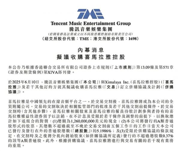 6月10日晚间,腾讯音乐娱乐集团(简称“腾讯音乐”)发布公告称,与喜马拉雅控股(简称“喜马拉雅”)签订并购协议及计划。