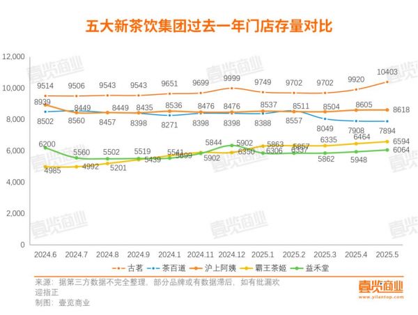 进入2025年5月,新茶饮头部五大品牌的门店扩张呈现出更加分化的格局。长期稳居“第二梯队之首”的古茗,终于在本月迈入“万店俱乐部”,现存门店数达10403家。