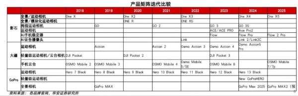 华安证券发现,在手持智能影像设备领域,影石创新共铺设6条产品线细分品类最全,产品迭代速度最快,年均更新3-5款;大疆3条产品线,其中Pocket相机为独家产品(为手机/相机+云台产品的便携替代),迭代速度较快,年均更新2-3款。