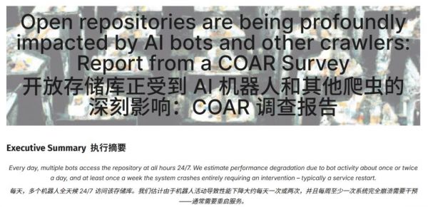 开放获取知识库联合会(COAR)在四月份的报告中指出,在其调查的66个成员中,超过90%的成员表示曾遭遇AI爬虫抓取内容。