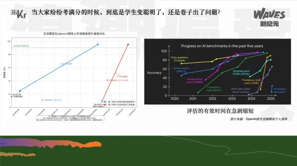 这两张图,左边是红杉之前在内部使用的benchmark,更新了两个版本,以及从推出到被大模型打爆100分的速度;第二张是我们引用了前一段时间一篇比较知名博客上的一张图,是市场上所有主流的benchmark从推出到大模型被拉爆到100分所使用的时间。可以看到,这个趋势是非常一致的,都阐明了AI上半场的一个问题——当强化学习被证明有效的时候,每当出现一个新的数据集和一个测试标准,大模型就一定会被训练到SOTA,市场上就会很快出现另外一个基准测试,大模型又会SOTA,这就会进入一个无限循环,这就是我们在上半场看到的一个挑战。