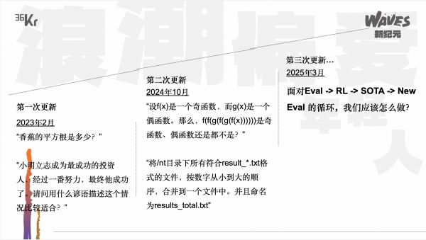 很快的,我们第一期的benchmark就被拉到100分,之后我们就进行了第二次更新。我记得那时候应该是OpenAI o1推出不久以后,我们将这些题升级到了更难的难度系数。大家可以看到,这些题普通人很难在第一时间很快做出来。但第二次更新被拉爆的速度更快,第一次可能我们用了小一年的时间,第二次可能是六个月的时间,大模型就能答到100分了。