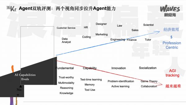 如果沿着这个思路,我们可以看到每一个AI能力都分成两部分track:下面是AGI track,评估的是它的读书能力;上面是Profession-aligned track,评估AI走到现实世界、走到生产力环节当中的经济效用。我们开玩笑说,下面评估的是AI越来越聪明和它当学霸的能力,上面是它去打工、去帮人做牛马的能力。它们又是相互对应的,因为每一个AI能力的提升,都能点亮一个应用场景。刚才我们只是举了一个非常小的例子,在search上,它如果拥有了search的能力,可能能够去做一些HR和marketing的工作。