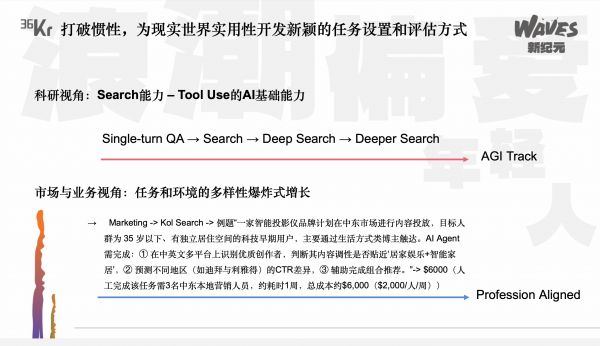 针对第一个问题,我展开分享一下我们背后的思考和逻辑。拿AI模型其中的一个子能力,就是search举例。如果AI在学校里上课会做越来越难的题,越来越难的题会体现什么地方?这就是我们的AGI track,它会先做一个简单的search题,然后一个deepsearch题,再是一个deeper search,这很像我们在学校里去学习的过程。
