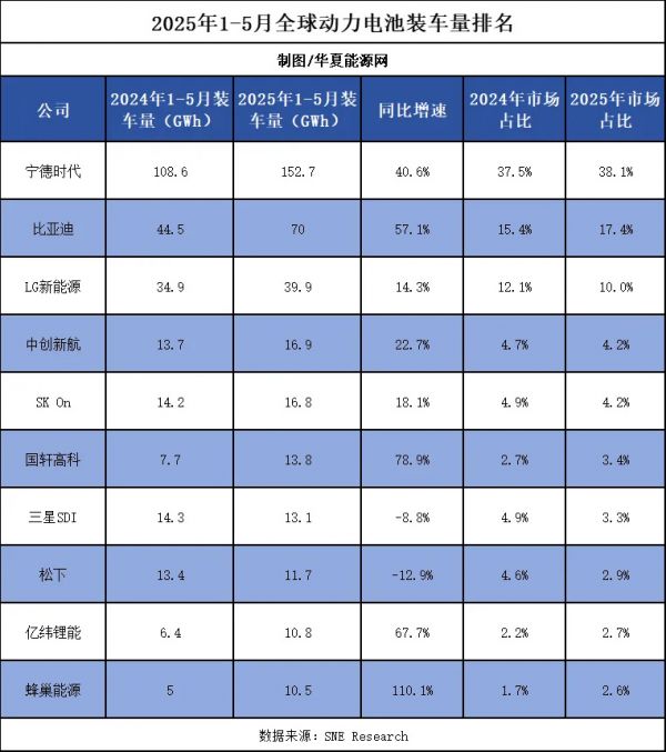 华夏能源网(公众号hxny3060)获悉,近日,韩国研究机构SNE Research发布了2025年1-5月全球动力电池装车量排名及数据,全球动力电池装车总量为401.3GWh,同比增长38.5%。