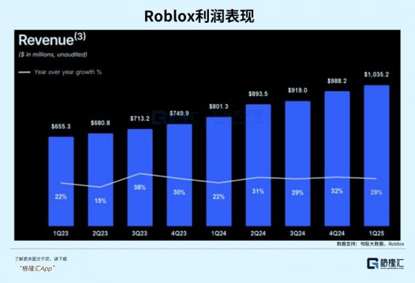 在2025年第一季度,Roblox收入达到10.35亿美元,同比增长29%,预订额攀升至12.07亿美元,同比增长31%;日活增长和用户交互市场都来到了新高,增长分别达到了26%和30%。
