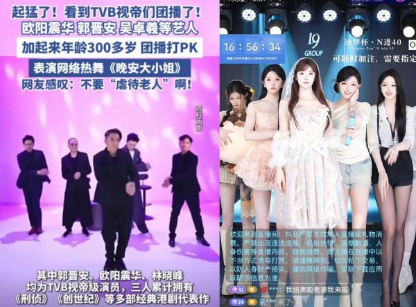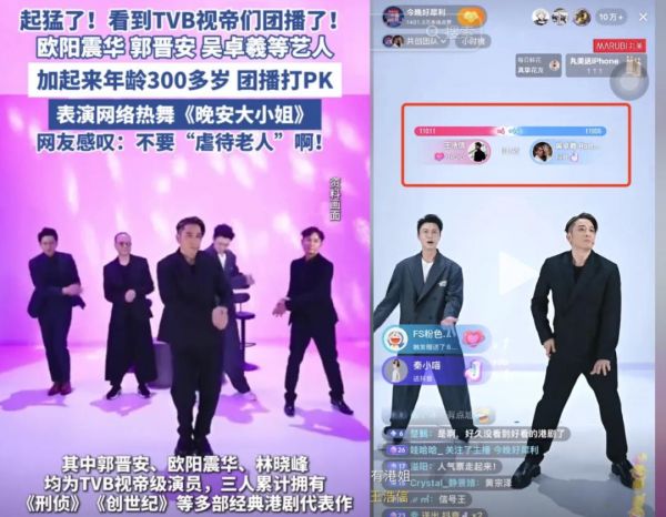 一是曾经的TVB视帝们转战团播跳《晚安大小姐》。这是典型的娱乐圈“过气老人”再就业的辛酸故事。当看到45岁的吴卓羲、41岁的高钧贤、41岁的王浩信、55岁的林晓峰、60岁的郭晋安、64岁的欧阳震华加起来306岁的TVB老人们身穿统一黑西装手忙脚乱跳二次元热舞,你就知道团播肯定是能赚钱的,否则这么多老戏骨愿意拉下脸面干这种癫事,若不是为五斗米折腰的话还能因为什么?