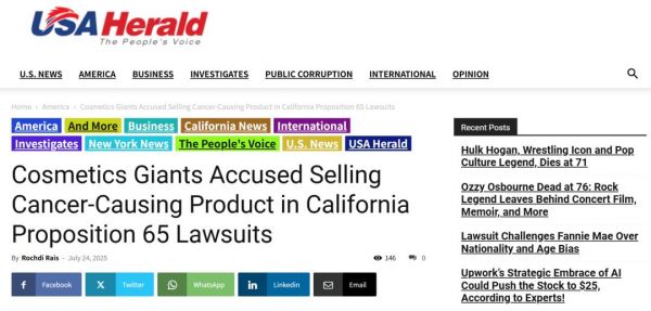 梳理事件本身来看,此次提起诉讼的主体是一家名为Initiative for Safer Cosmetics的消费者安全组织,其于周二(7月22日)在洛杉矶高等法院提起四项独立诉讼。