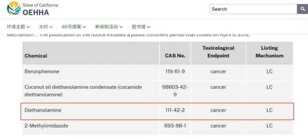 不过,2012年6月,由于二乙醇胺被IARC列为2B类物质,因而也将二乙醇胺列入加州已知致癌物质清单。