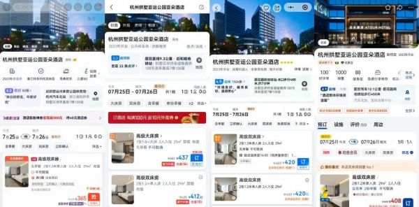以7月25日—7月26日为例,携程、美团和飞猪三个平台上,都显示杭州康莱德酒店依旧有客房可以预定,但在京东上,杭州康莱德酒店显示该日期暂无可以定房间。同时,搜索杭州拱墅亚运公园亚朵酒店的双床房,携程、美团、飞猪和京东四个平台中,价格最低的反而是飞猪平台。