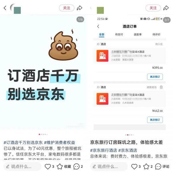 社交平台上的“避雷”声,似乎也暂时盖过了支持的声音。小红书上,“避雷,千万不要用京东订酒店!”“京东酒店为什么会自动退款?”“京东订酒店体验感太差”等类似的帖子不在少数。一些曾经喊着希望京东把价格打下来的消费者,也转而吐槽京东“让人失望”。