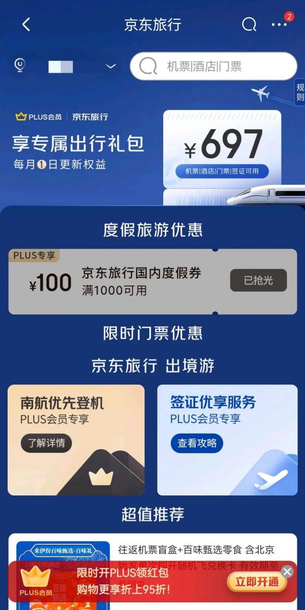 京东针对PLUS会员推出的酒旅服务