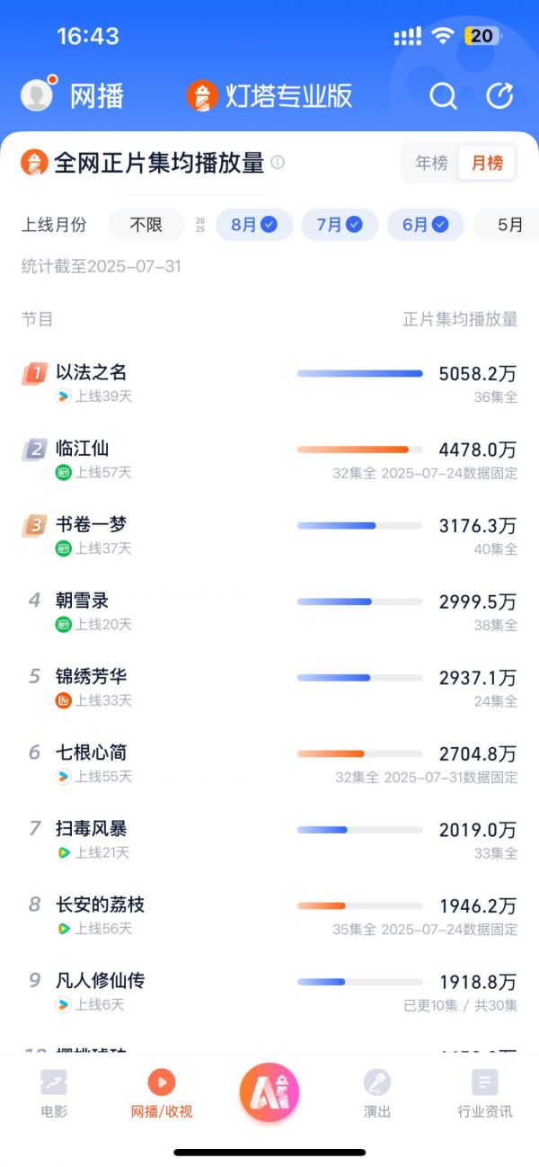 以目前多方数据平台“认证”的暑期档头名选手《以法之名》为例,灯塔正片集均落在5000万,云合热播期集均最终大致落在3500万范畴。在豆瓣上,这部剧的打分人数为12万+。《临江仙》《书卷一梦》在市场影响力上还要再“下”一层。