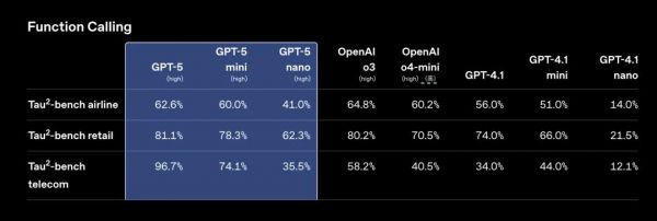 GPT-5,当然也不例外。它对于工具调用能力进行了着重微调。在模拟真实世界场景的测试集Tau²中,它在电信领域领域的测试结果,较o3和GPT-4.1都有长足的进步。