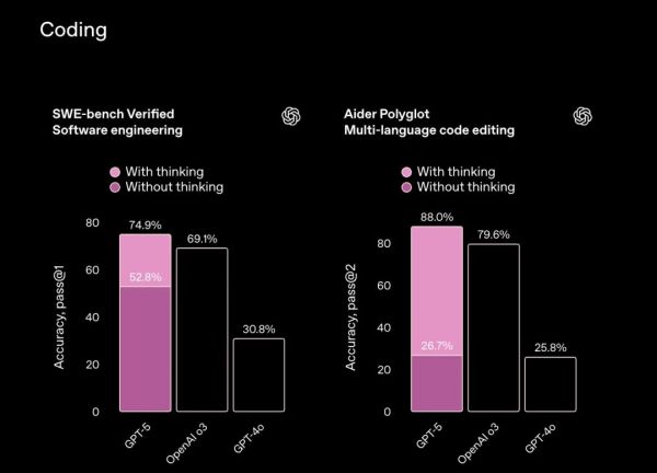 编程是现在所有的AI模型又一个着重强调的能力,GPT-5在SWE-bench和Aider Polyglot等测试上与o3相比有了明显提高,但是在SWE-bench这个指标上,只领先Claude 4.1 Opus这个直接竞争对手0.4%。