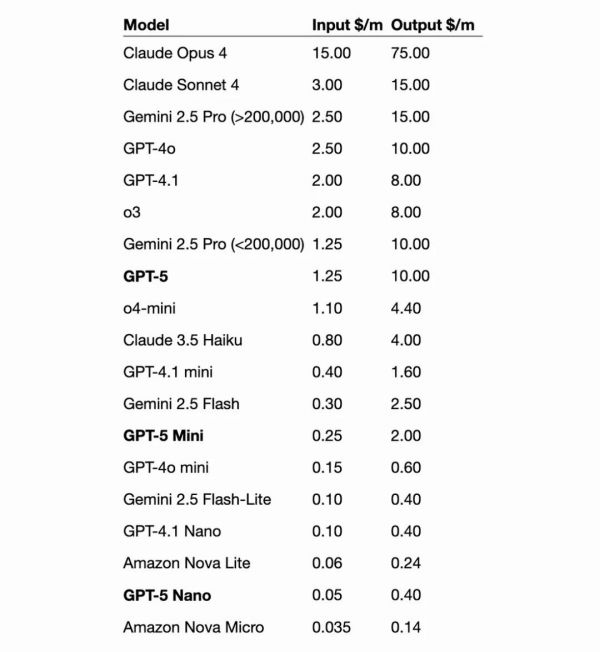 在企业级的商业化方面,GPT-5将其API价格控制在输入1.25美元/百万tokens,输出10美元/百万tokens,直接对标Gemini 2.5Pro,大幅低于Claude 4 Opus,这对于企业和开发者们比较有吸引力。
