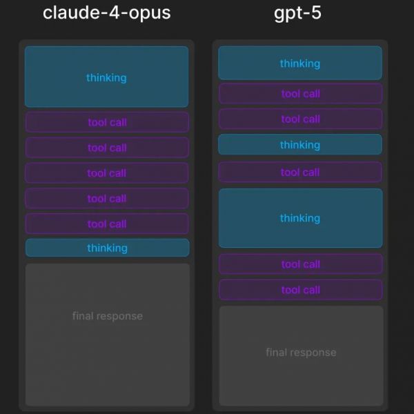 这其中的关键,就在于模型调用工具的方式不同。在与Claude 4 Opus的对比中,GPT-5会在编程过程中进行更多次的思考,类似于边想边做,不断迭代;而Claude 4 Opus则更类似于想清楚了再做。