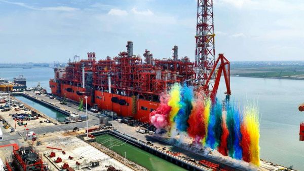 8月26日,我国自主建造的最大吨位、最大储气量的浮式液化天然气生产装置"NGUYA FLNG"在江苏启东启航,驶往刚果(布)附近海域的项目部署地。该装置由CMC资本投资的惠生清洁能源科技集团股份有限公司为意大利埃尼集团打造,全长376米,液化天然气年产能达240万吨。