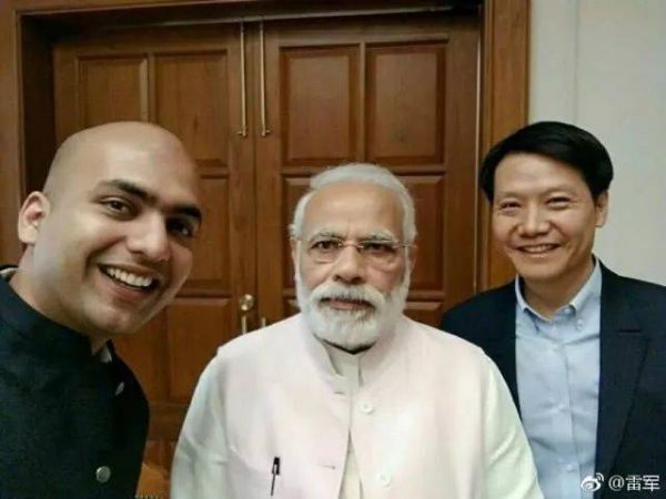从左到右依次:小米印度负责人Manu Jain,印度总理莫迪,小米创始人雷军