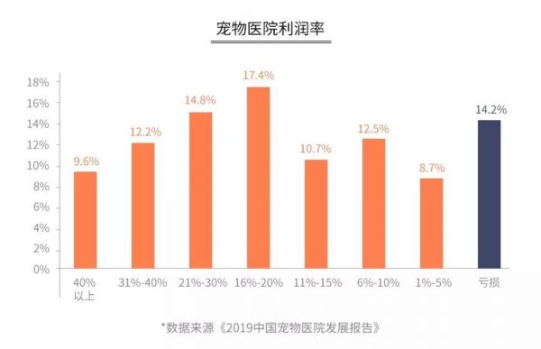 根据相关报告,能维持良好盈利状况的宠物医院,占比不足30%,有31.9%利润率在1%到15%之间,还有14.2%处于亏损状态。