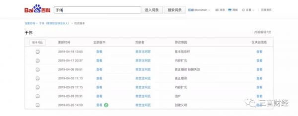 据百度百科的历史词条编辑记录显示,于伟词条于2019年3月26日创建,经历7次修改,最终版本是于2019年4月18日完成,编辑者均为同一昵称。