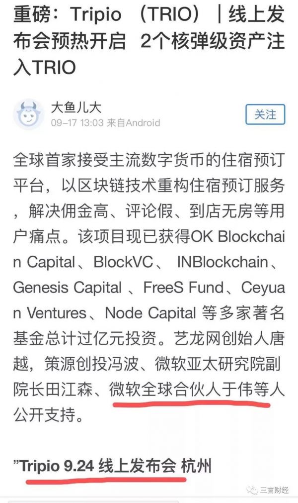 根据一个基于区块链的去中心化旅行服务市场平台,Tripio的项目介绍,于伟目前担任该项目的顾问,其顾问简介中,同样使用的是“微软全球合伙人和微软亚太研发工程院副院长”头衔。