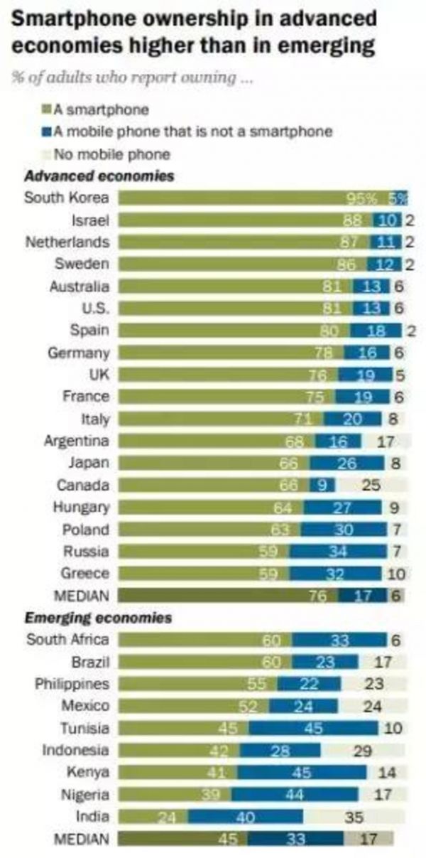 部分国家智能手机渗透率(来自皮尤研究中心,2018年)