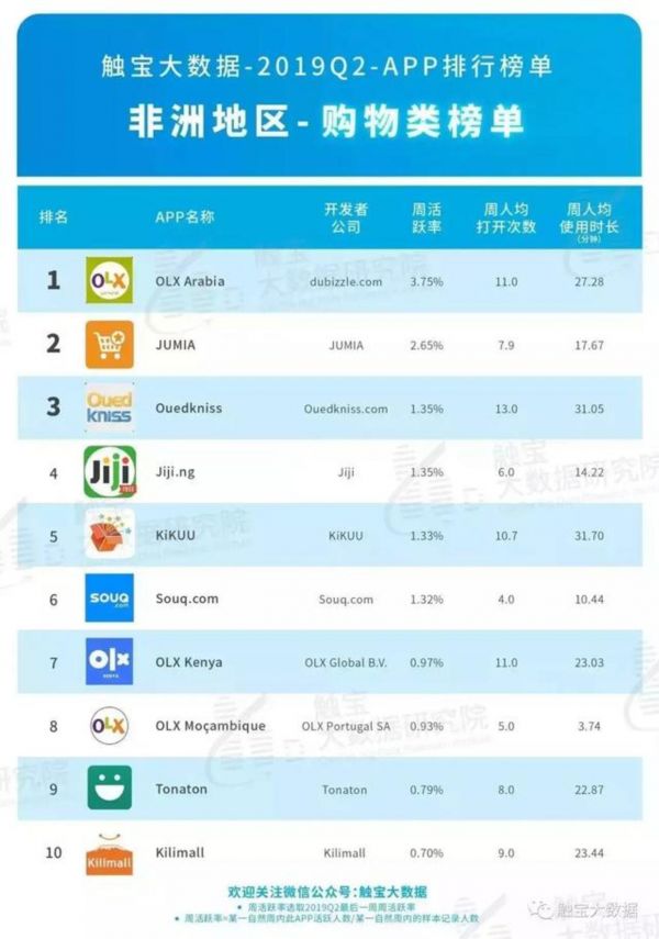 在触宝发布的非洲2019年第二季度APP排行榜单中,除了本土平台Jumia以及全球平台OLX外,中国背景的 Kikuu 和 Kilimall 也进入前十。
