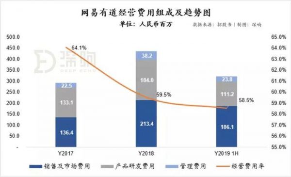 网易有道经营费用在报告期内相对平稳,经营费用率在报告期呈现下降趋势,在2017年、2018年以及2019年上半年分别为64.1%、59.5%以及58.5%。